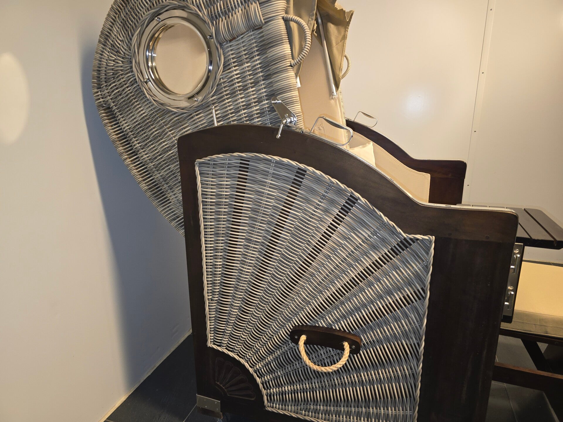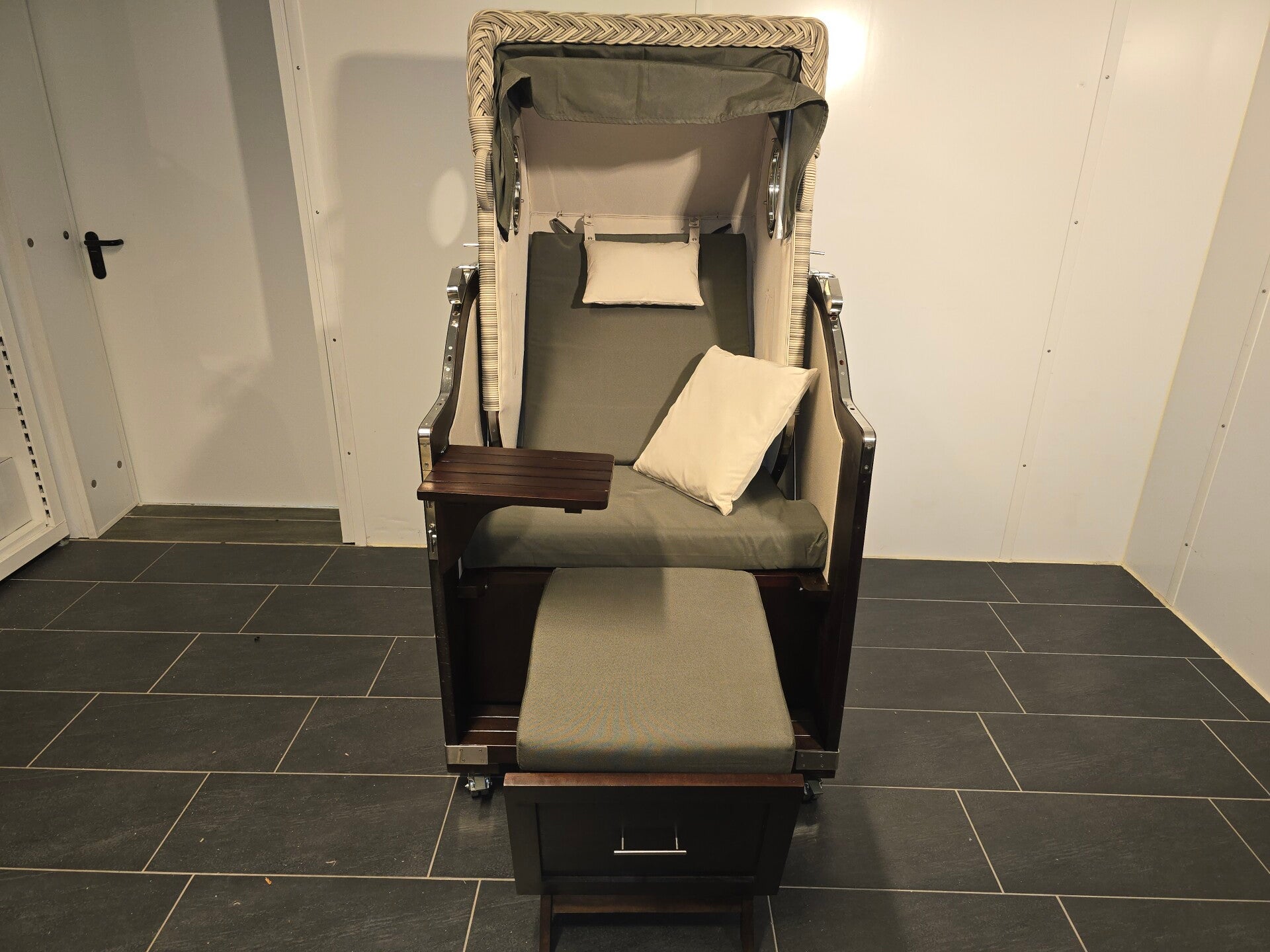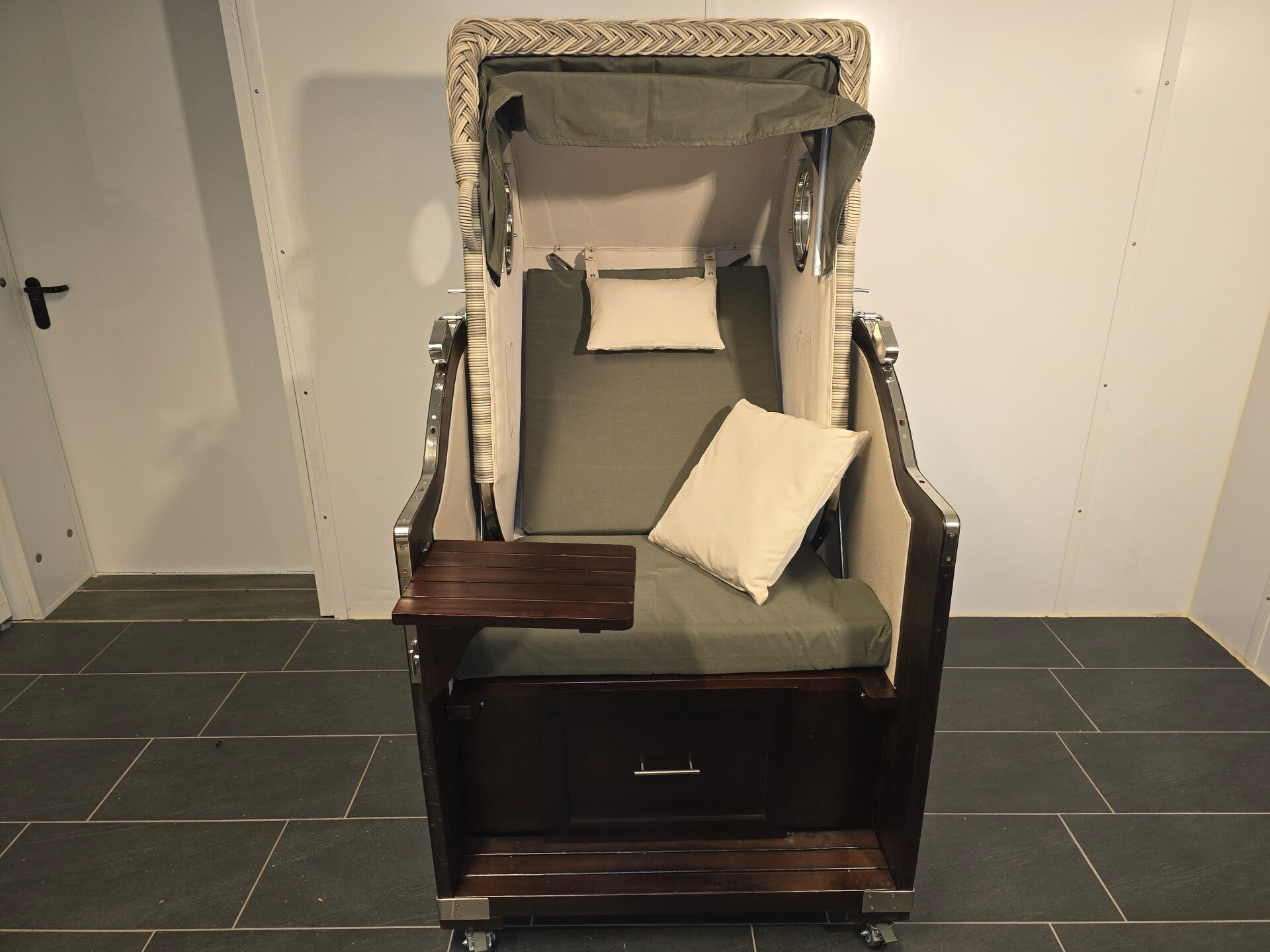 - Ausstattung: 1 schwenkbarer Tisch, ausziehbare Fußstützen, Oberkorb mit Bullaugen