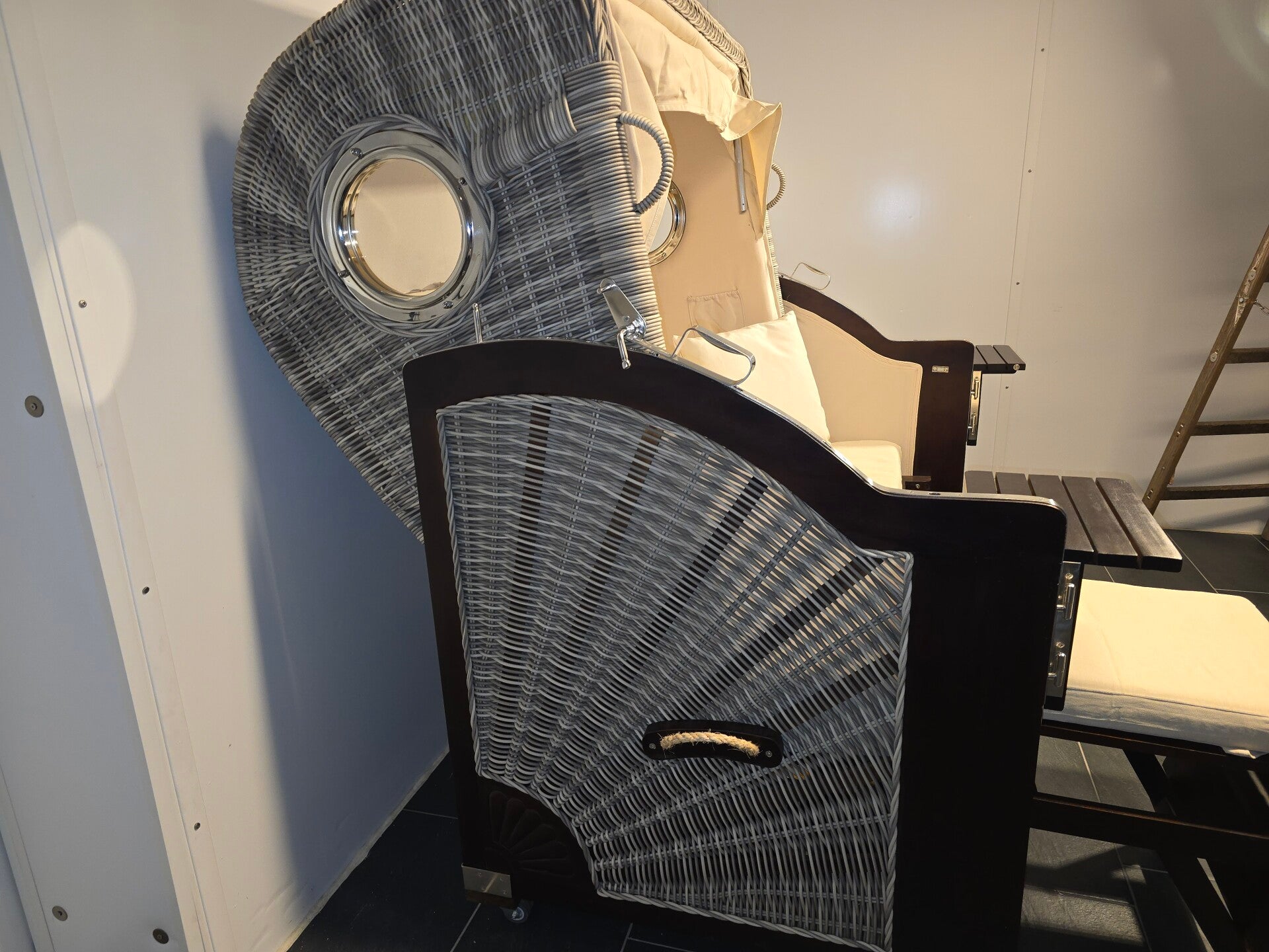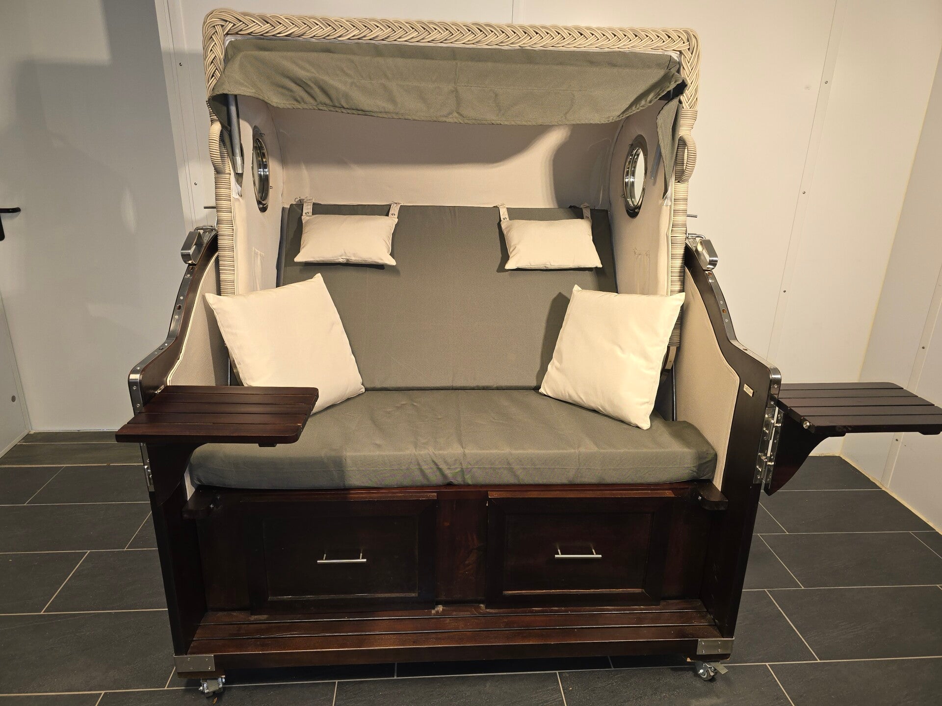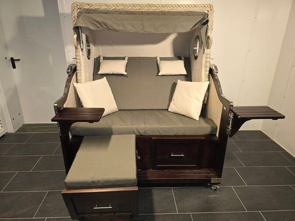 - Ausstattung: 2 schwenkbare Tische, ausziehbare Fußstützen, Oberkorb mit Bullaugen