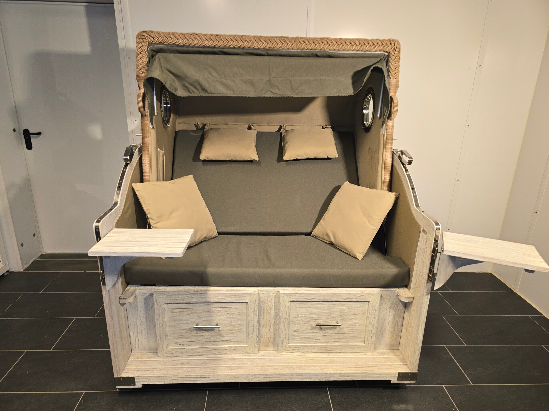 - Ausstattung: 2 schwenkbare Tische, ausziehbare Fußstützen, Oberkorb mit Bullaugen
