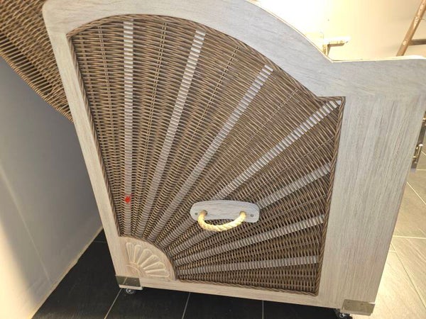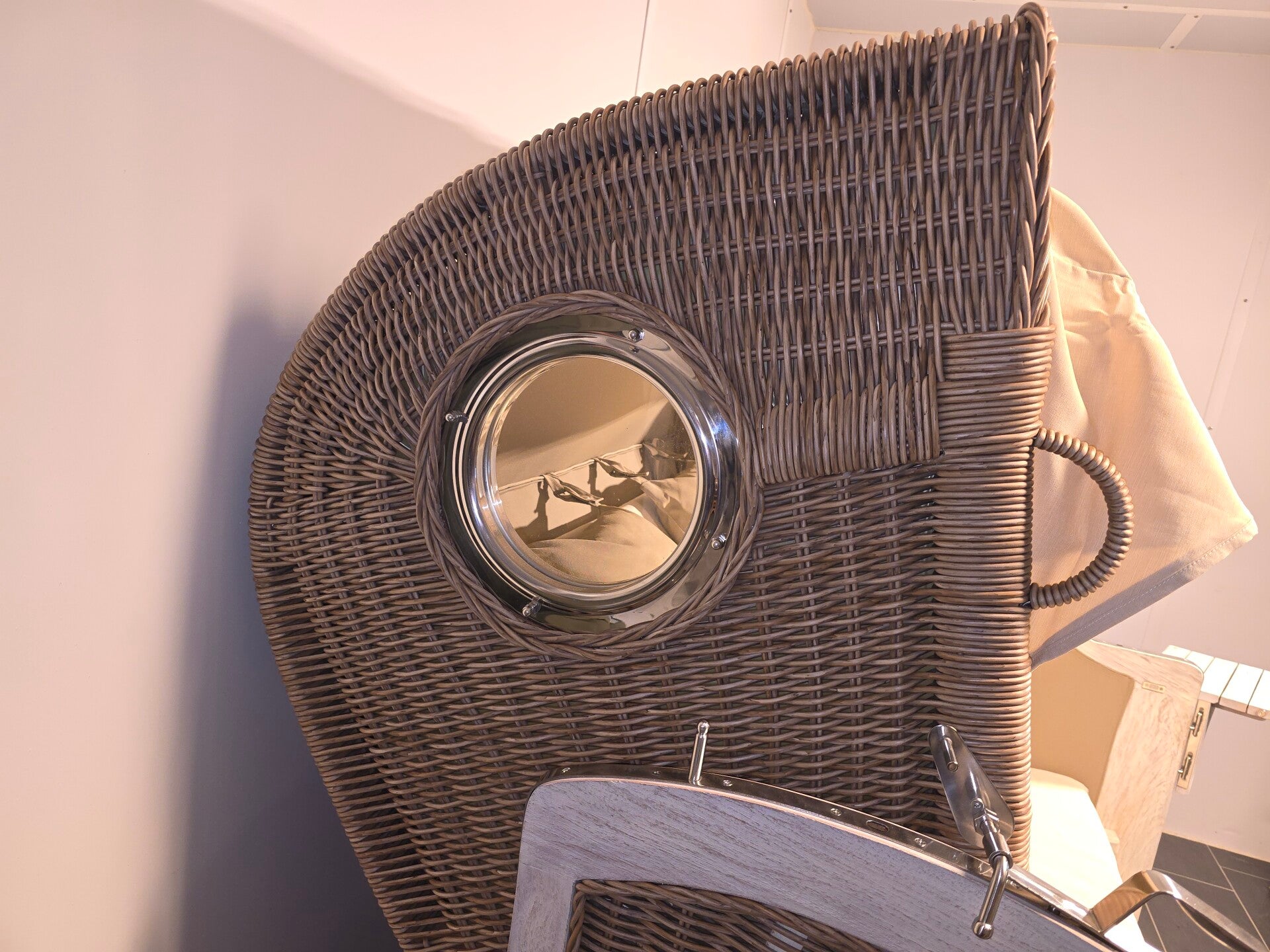 Mit seiner Kombination aus robustem Mahagoni-Holz White-Wash lasiert und witterungsbeständigem 6 mm Voll-PE-Geflecht in edlem Natural-Forest zieht dieser Strandkorb regelmäßig Blicke auf sich. Die Beschläge aus Edelstahl und Aluminium-Bullaugen setzen hochwertige Akzente und zeugen von sorgfältiger Handarbeit und hochwertiger Verarbeitung.