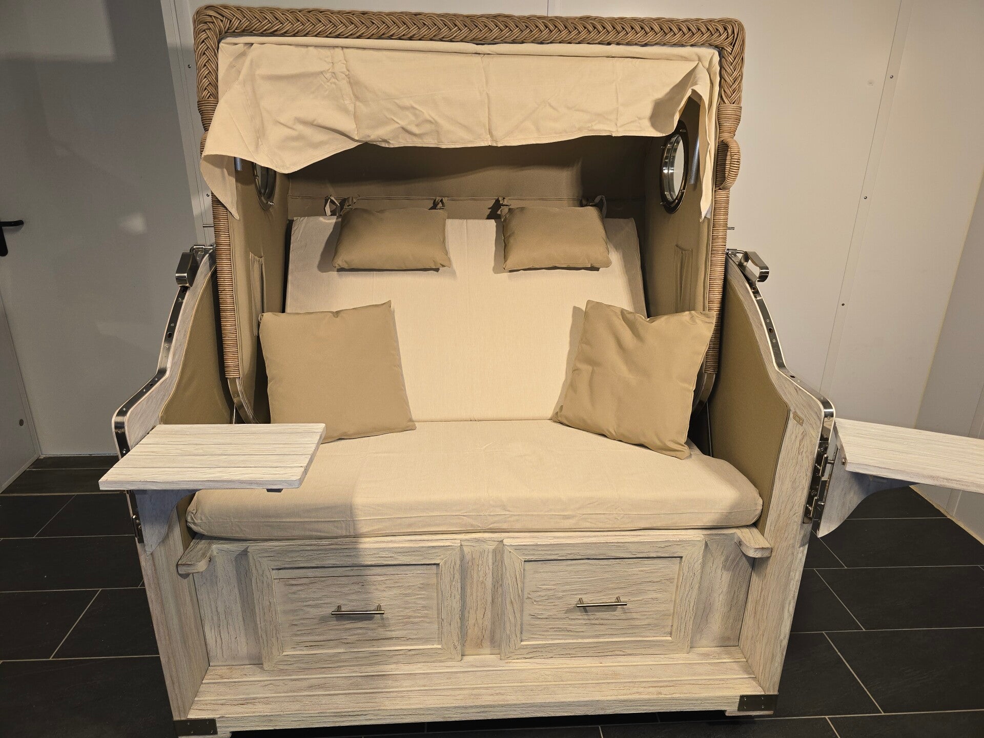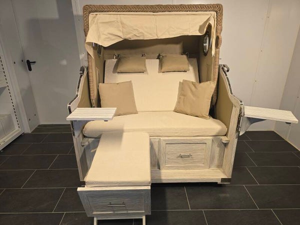 Der Strandkorb Pelikan XL Mahagoni White-Wash ist Ihr perfekter Ort zur Entspannung im Garten, auf der Terrasse oder im Indoorbereich.