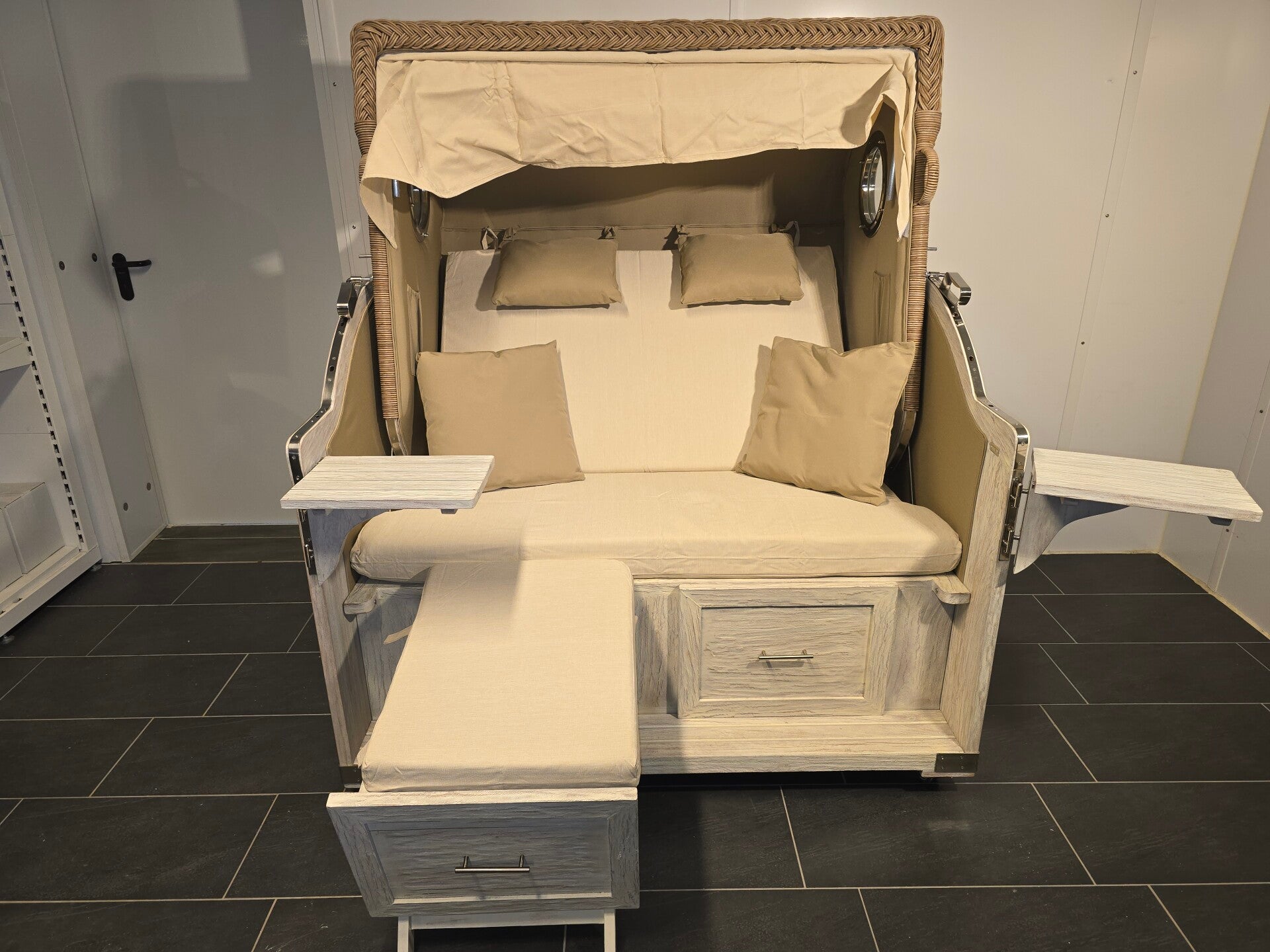 Mit seiner Kombination aus robustem Mahagoni-Holz White-Wash lasiert und witterungsbeständigem 6 mm Voll-PE-Geflecht in edlem Natural-Forest zieht dieser Strandkorb regelmäßig Blicke auf sich. Die Beschläge aus Edelstahl und Aluminium-Bullaugen setzen hochwertige Akzente und zeugen von sorgfältiger Handarbeit und hochwertiger Verarbeitung.