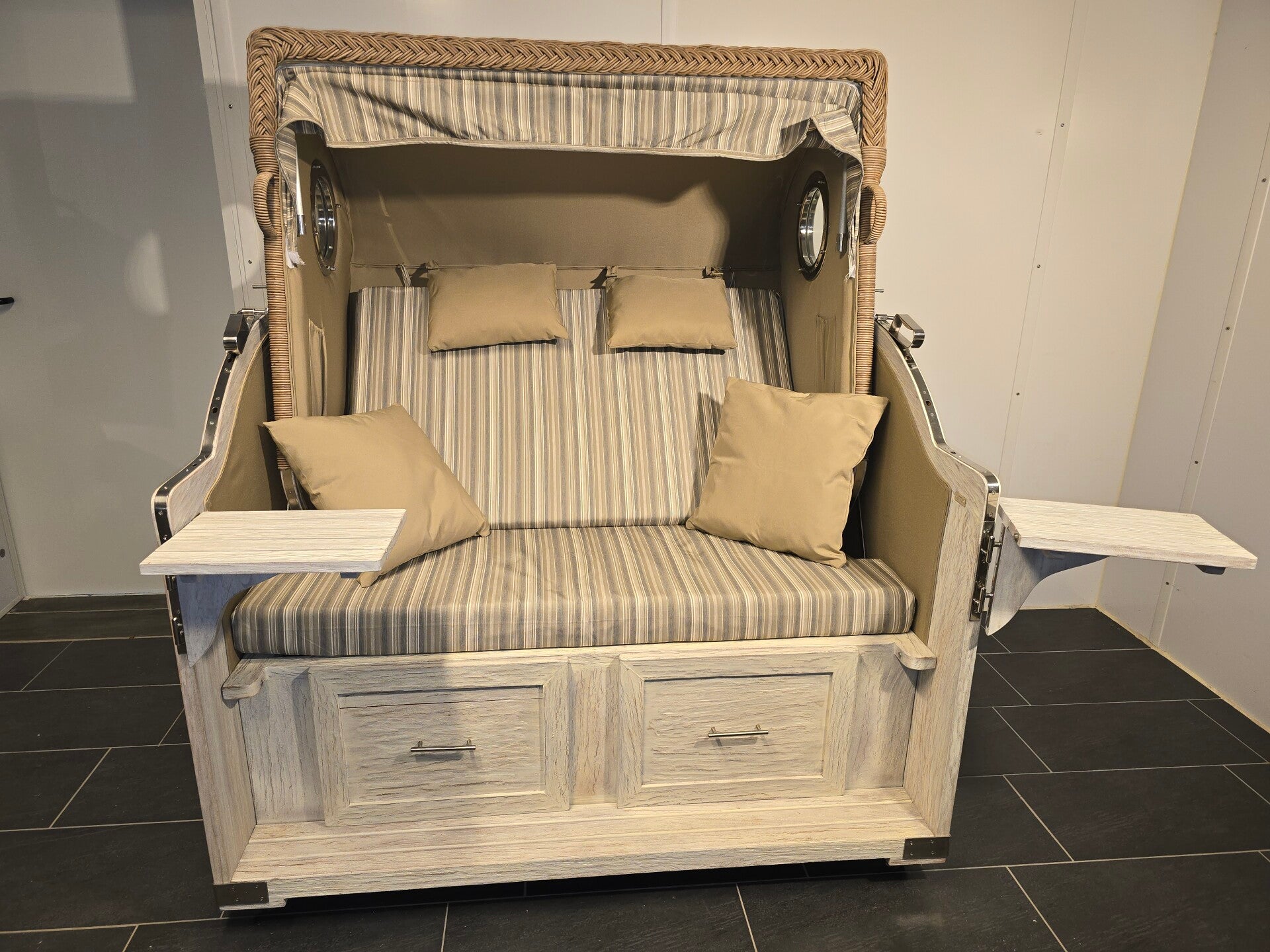 - Ausstattung: 2 schwenkbare Tische, ausziehbare Fußstützen, Oberkorb mit Bullaugen