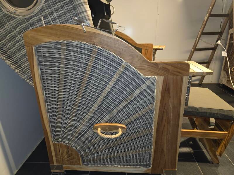 Mit seiner Kombination aus robustem Teakholz und witterungsbeständigem 6 mm Voll-PE-Geflecht in edlem White-Sonic zieht dieser Strandkorb regelmäßig Blicke auf sich. Die Beschläge aus Edelstahl Edelstahl-Bullaugen setzen hochwertige Akzente und zeugen von sorgfältiger Handarbeit und hochwertiger Verarbeitung.