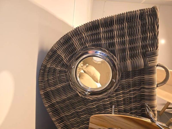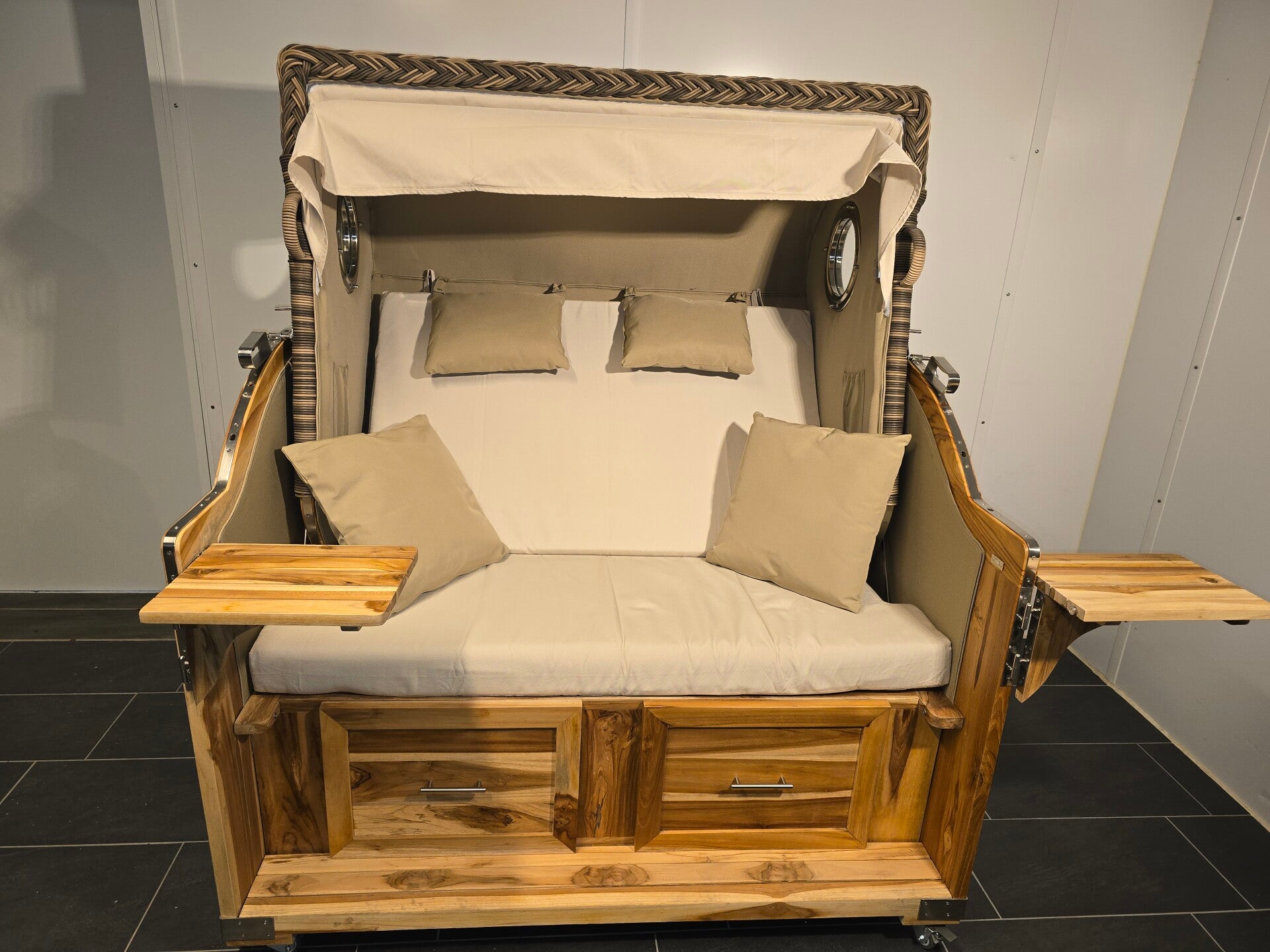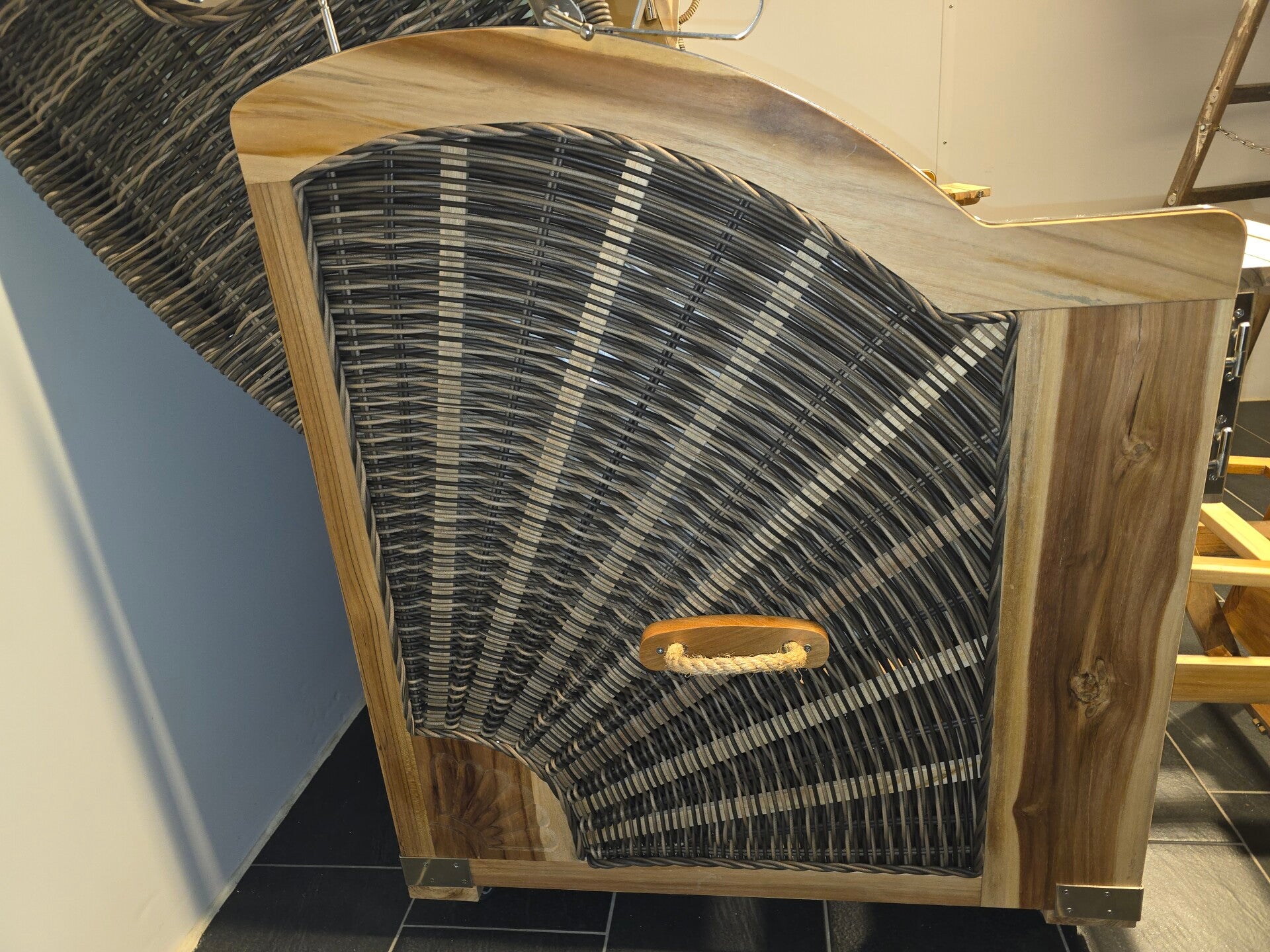 Mit seiner Kombination aus robustem Teakholz und witterungsbeständigem 6 mm Voll-PE-Geflecht in edlem Dark-Sonic zieht dieser Strandkorb regelmäßig Blicke auf sich. Die Beschläge aus Edelstahl Edelstahl-Bullaugen setzen hochwertige Akzente und zeugen von sorgfältiger Handarbeit und hochwertiger Verarbeitung.