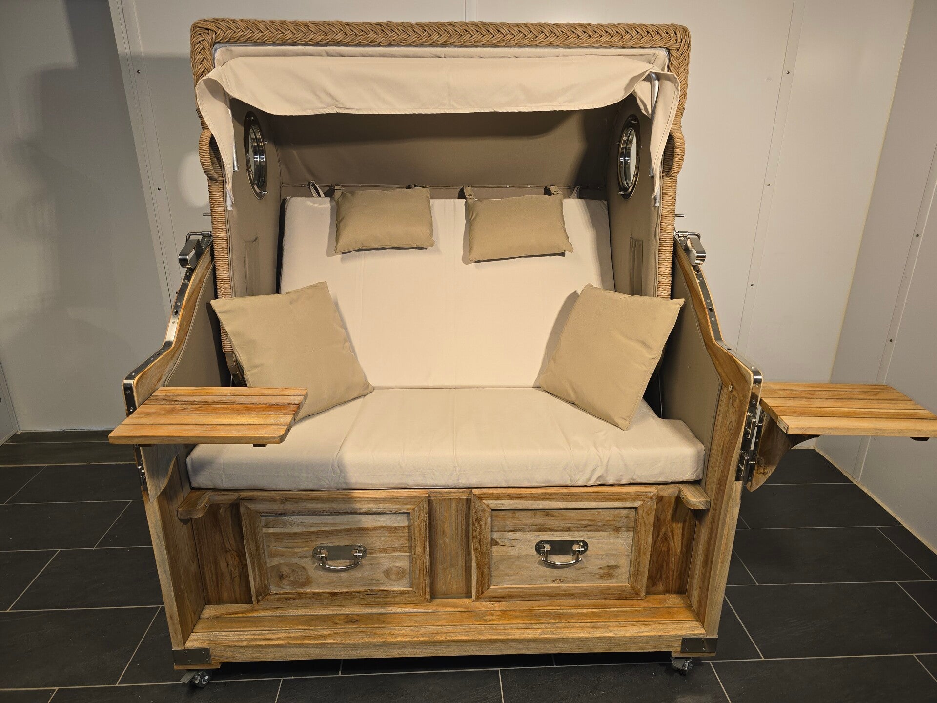 Mit seiner Kombination aus robustem Teakholz rustic und witterungsbeständigem Voll-PE-Geflecht in twisted (verdrehter Form) Cathrine zieht dieser Strandkorb regelmäßig Blicke auf sich. Die Beschläge aus Edelstahl und die Edelstahl-Bullaugen setzen hochwertige Akzente und zeugen von sorgfältiger Handarbeit und hochwertiger Verarbeitung.